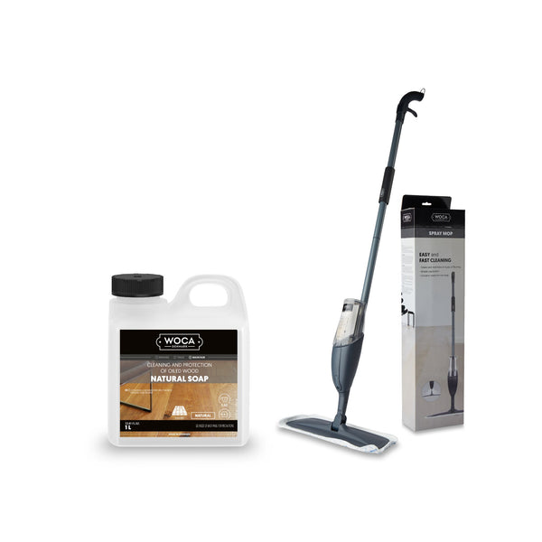 Clean your oil-finished wood floors every two weeks with WOCA Denmark Natural Soap. This plant-based and gentle soap actually cleans the surface and protects/nourishes the wood. Once clean, the floor will have a thin, invisible protective layer on top; this prevents dirt and stains from settling inside, making further maintenance much easier.