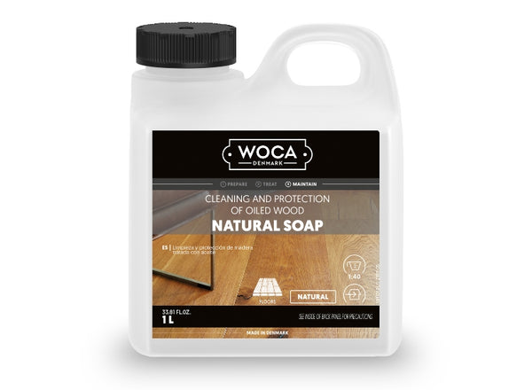 Clean your oil-finished wood floors every two weeks with WOCA Denmark Natural Soap. This plant-based and gentle soap actually cleans the surface and protects/nourishes the wood. Once clean, the floor will have a thin, invisible protective layer on top; this prevents dirt and stains from settling inside, making further maintenance much easier.